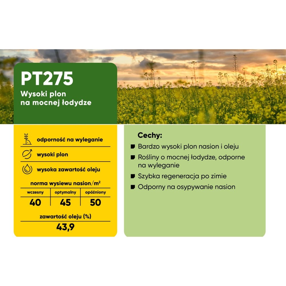 Odmiana PT275 to wysoki potencjał plonowania na bardzo mocnej łodydze, która powoduje wysoką tolerancję na wyleganie. Siew tej odmiany zalecany jest na glebach średnich i bardzo dobrych. Bardzo szybki rozwój początkowy daje nam możliwości siewów w terminach wczesnych, optymalnych i opóźnionych. Należy jednak uwzględnić że regulacja przy siewie wczesnym może być wymagana 2 krotna. Ładnie nadrabia siewy w terminach opóźnionych.