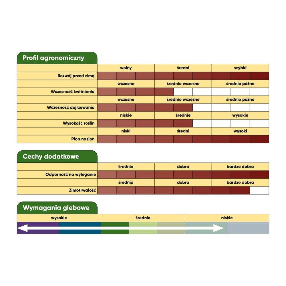 Średniowczesny termin kwitnienia i dojrzewania oraz odporność na pękanie łuszczyn  dają tej odmianie nieco więcej czasu na równomierne doschnięcie do dojrzałości zbiorczej. Bardzo dobra odmiana do siewów "Strip Till".  zalecane siewy na glebach średnich i bardzo dobrych.