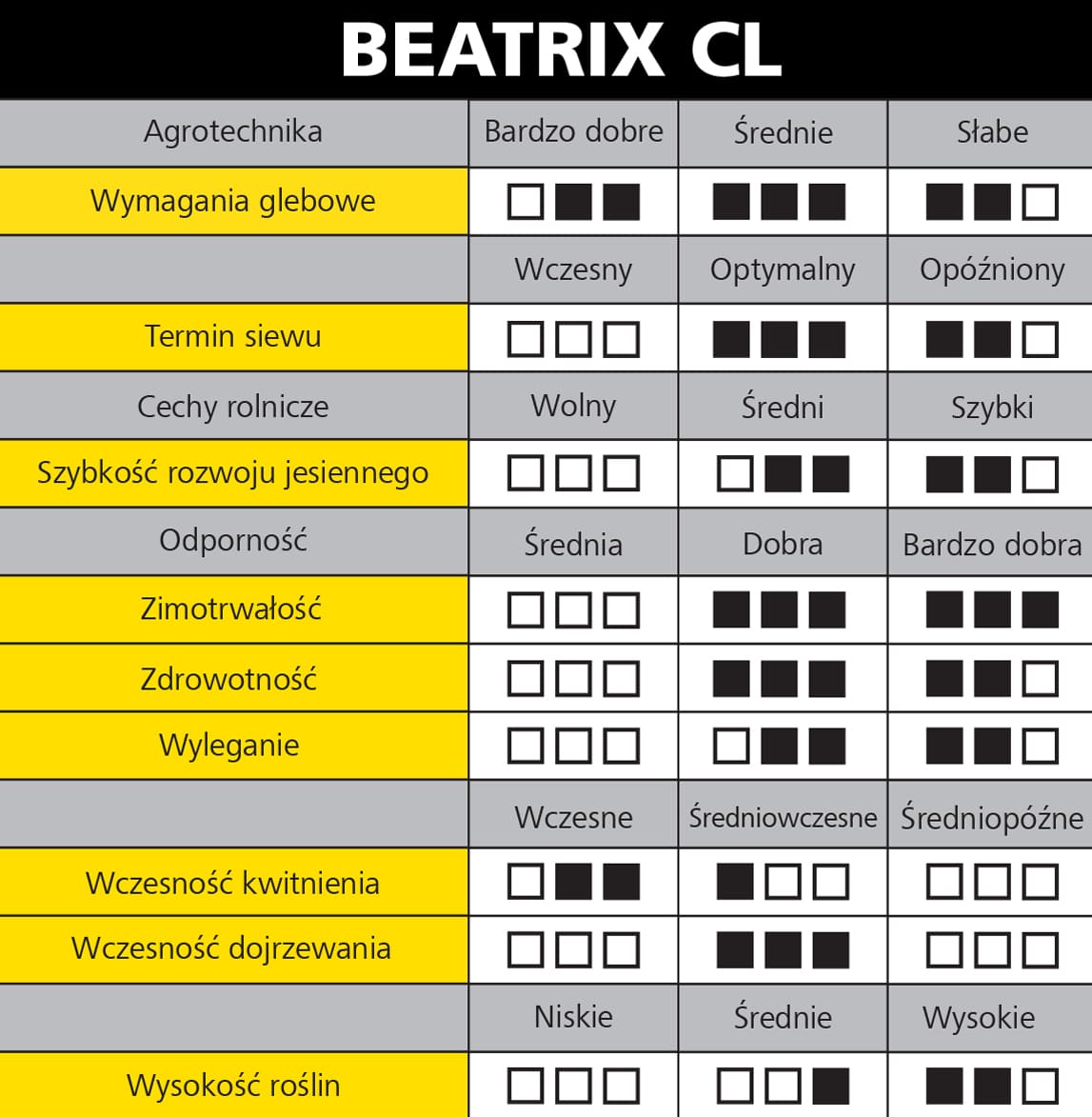 BEATRIX CL wyróżnia sie wysoka zdrowotnością, która wynika z obecności genów RLM7 i TuYV. Charakteryzuje sie dynamicznym rozwojem diam nonummy w okresie jesiennym. Może być wysiewana w opóźnionych terminach. Odmiana dostosowana do warunków klimatu kontynentalnego – posiada dobra zimotrwałość oraz wysoka tolerancje na okresowe susze.