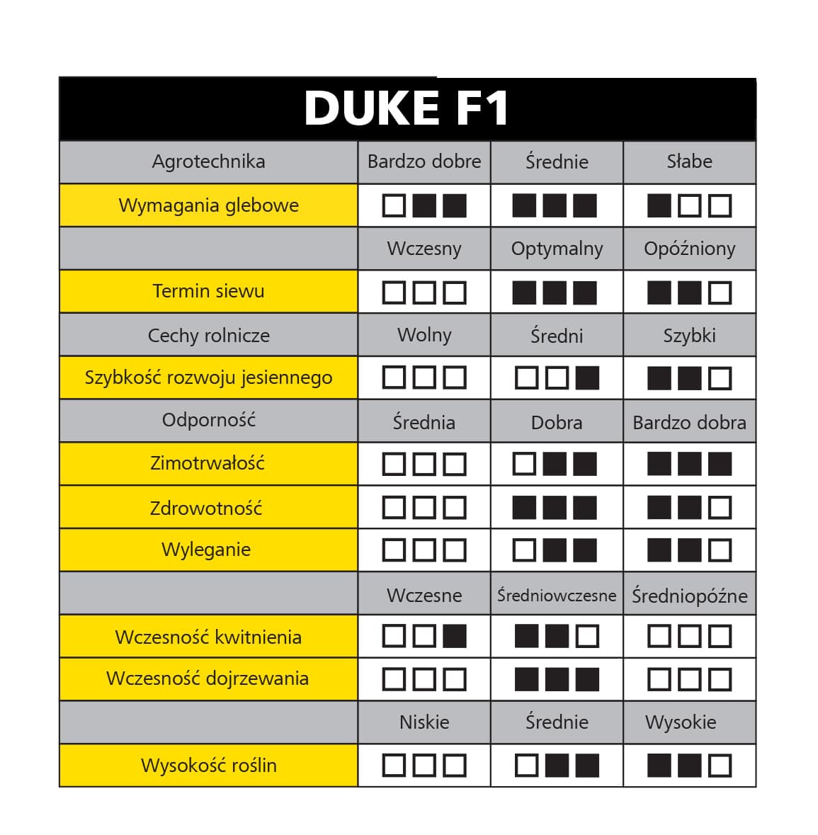 DUKE F1 to mieszaniec z segmentu odmian z odpornością na wirusa żółtaczki rzepy (TuVY). Skupia wiele cech pozytywnie wpływających na wysokość i niezawodność plonowania. Odmiana charakteryzująca się bardzo dobra zdrowotnością i doskonała kombinacja cech: 2 w 1 – podwójna odporność na choroby: