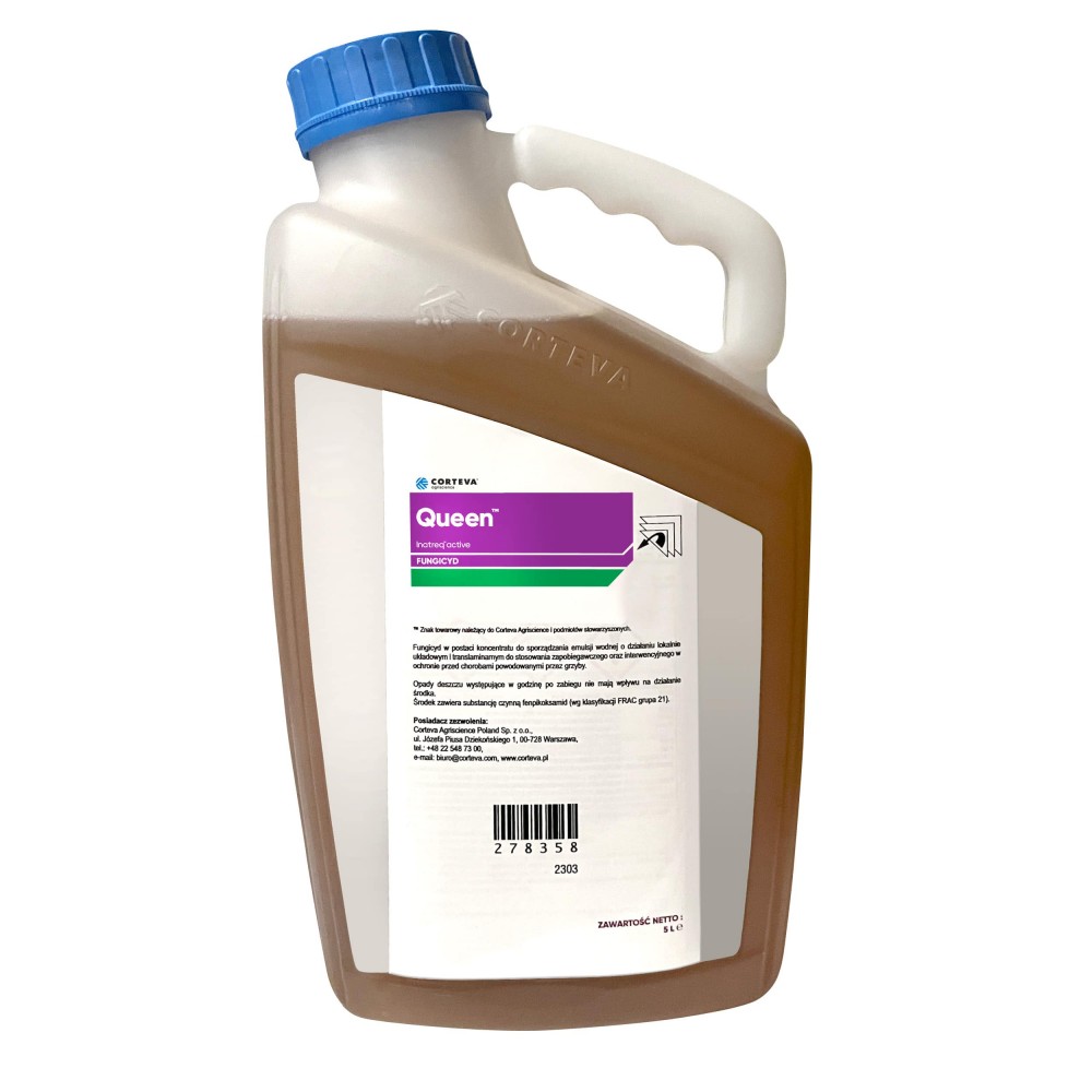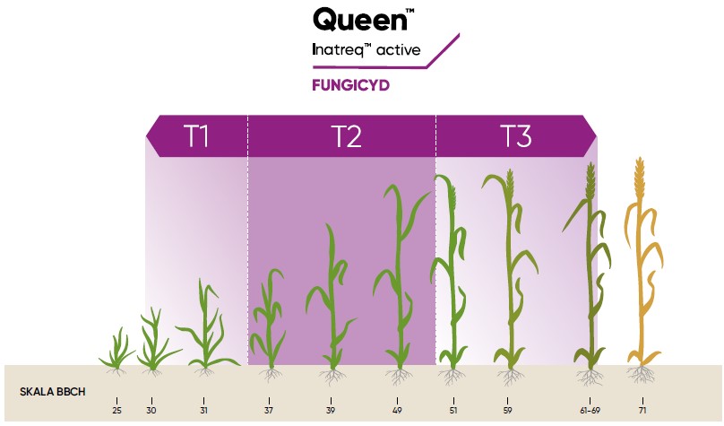 Queen™ należy stosować od początku fazy strzelania w źdźbło do końca fazy kwitnienia (BBCH 30-69) w dawce 1,0- 1,5 l/ha. Dawka stosowania uzależniona jest od spodziewanej presji chorobowej występującej na plantacji. Najlepszy termin dla zastosowania produktu to tzw. zabieg T2 w okresie faz rozwoju zbóż BBCH 37-51 (od liścia podflagowego, przez flagowy do początku kłoszenia). Środek stosować zapobiegawczo lub z chwilą wystąpienia pierwszych objawów choroby.